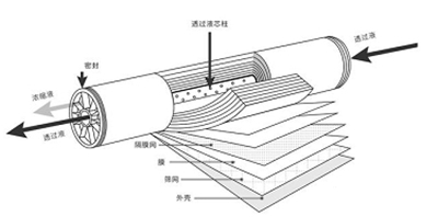 ②膜元件的給水側有一個濃水密封圈、注意密封圈的安裝方向是口朝上游張開。濃水密封圈的功能是保證原水全部流到膜元件內不發生旁流。原水自身流速會使濃水密封圈的開口朝壓力容器內壁緊壓密封。若密封圈的安裝方向相反,原水不能密閉,造成一部分原水流到膜元件外側,使膜表面流速降低,導致產生結垢,從而縮短膜的使用壽命。